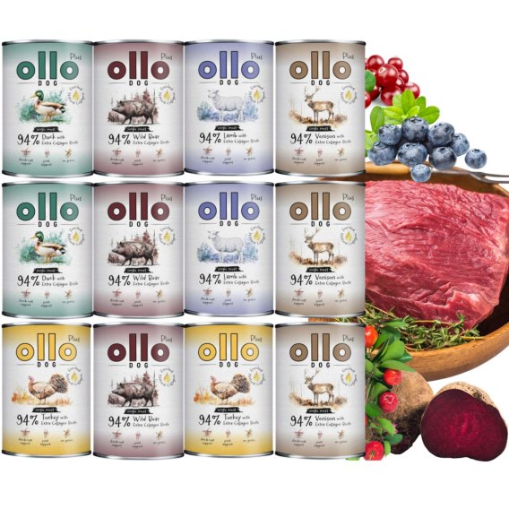 OLLO PLUS KOLAGEN MIX SMAKÓW 12x400 g - dzik, jeleń, kaczka, jagnięcina, indyk | karma mokra dla psa
