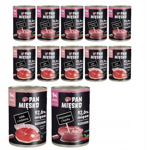 Zestaw Pan Mięsko dla szczenąt 6x400g 2 smaki: 6 x indyk z wołowiną oraz6 x wieprzowina z kaczkąPAN MIĘSKO INDYK Z WOŁOWINĄ