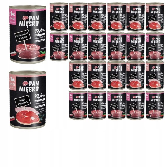 Zestaw Pan Mięsko dla szczenąt 24x400g 2 smaki: 12 puszek indyk z wołowiną oraz 12 wieprzowina z kaczką + 2 próbki Wiejska Zagroda Zdrowy Start + 2 Próbki Pan Mięsko