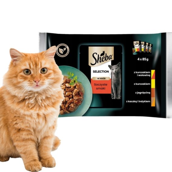 Sheba® Selection Soczyste Smaki to mieszanka starannie wyselekcjonowanych, delikatnych kawałków w przepysznym sosie. Propozycja posiłków w 4 wariantach smakowych, kawałki z: kurczakiem i wołowiną, kurczakiem, jagnięciną, kaczką i indykiem, zachwyci podniebienia nawet najbardziej wymagających kotów. Sekretem mistrzowskiej receptury Sheba® Selection Soczyste Smaki są wysokiej jakości naturalne składniki oraz witaminy i minerały. W każdej saszetce znajdują się składniki odżywcze, wspierające prawidłowe funkcjonowanie Twojego kota. Pozwól swojemu kotu na kulinarną rozkosz, aby mógł delektować się pyszną karmą Sheba® Selection Soczyste Smaki, która zaspokoi nawet najbardziej wybredny apetyt.