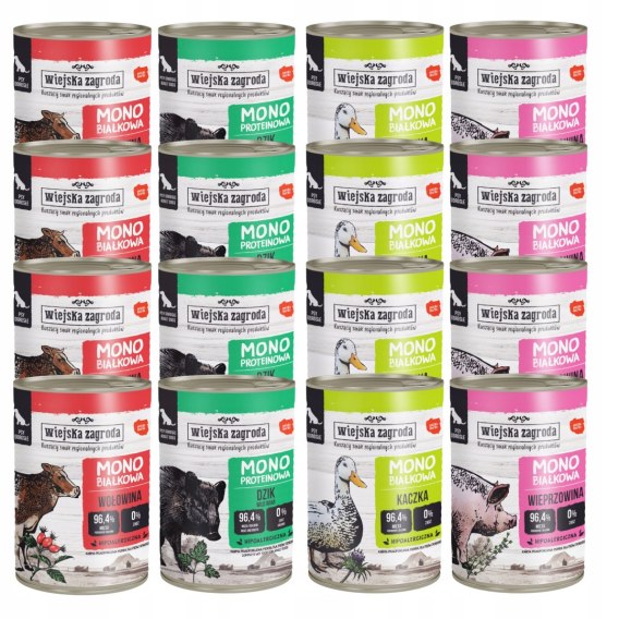 WIEJSKA ZAGRODA MONOPROTEINA MOKRA KARMA DLA PSÓW DOROSŁYCHMIX SMAKÓW 12 X 400 GW SKŁAD ZESTAWU WCHODZĄ: